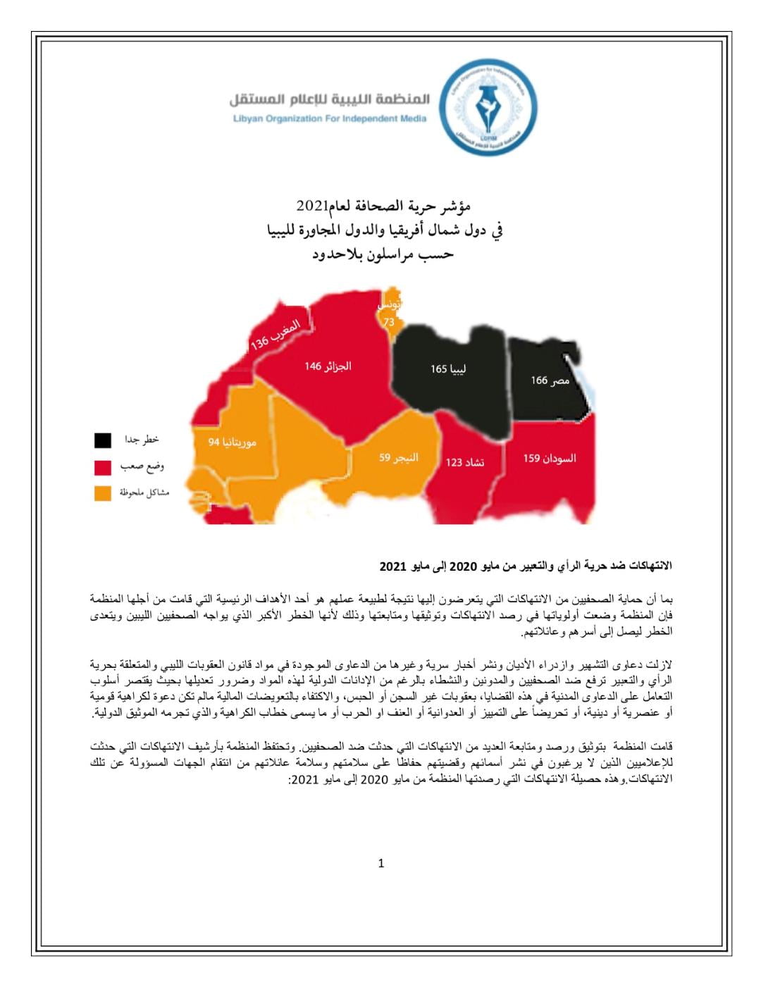 التقرير المرفق هو حصيلة الانتهاكات التي رصدتها المنظمة الليبية للإعلام المستقل في الفترة من مايو 2020 إلى مايو 2021 وهو لس حصريا وتحتفظ المنظمة بأرشيف الانتهاكات التي حدثت ضد صحفيين أو مدونين بسبب آرائهم وهم لا يرغبون في نشر أسمائهم وقضيتهم حفاظا على سلامتهم وسلامة عائلاتهم.